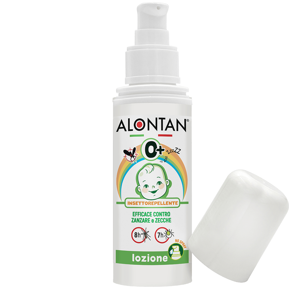 Alontan Lozione 0+ is a non spray lotion, to protect newborns from breathing any sprayed product containing the active substance (etil butilacetilaminopropionato 10%). Alontan Lozione 0+ protects immediately after application. It absorbs easily and quickly. Protects against common mosquitoes, tiger mosquitoes (8 hours) and ticks (7 hours).