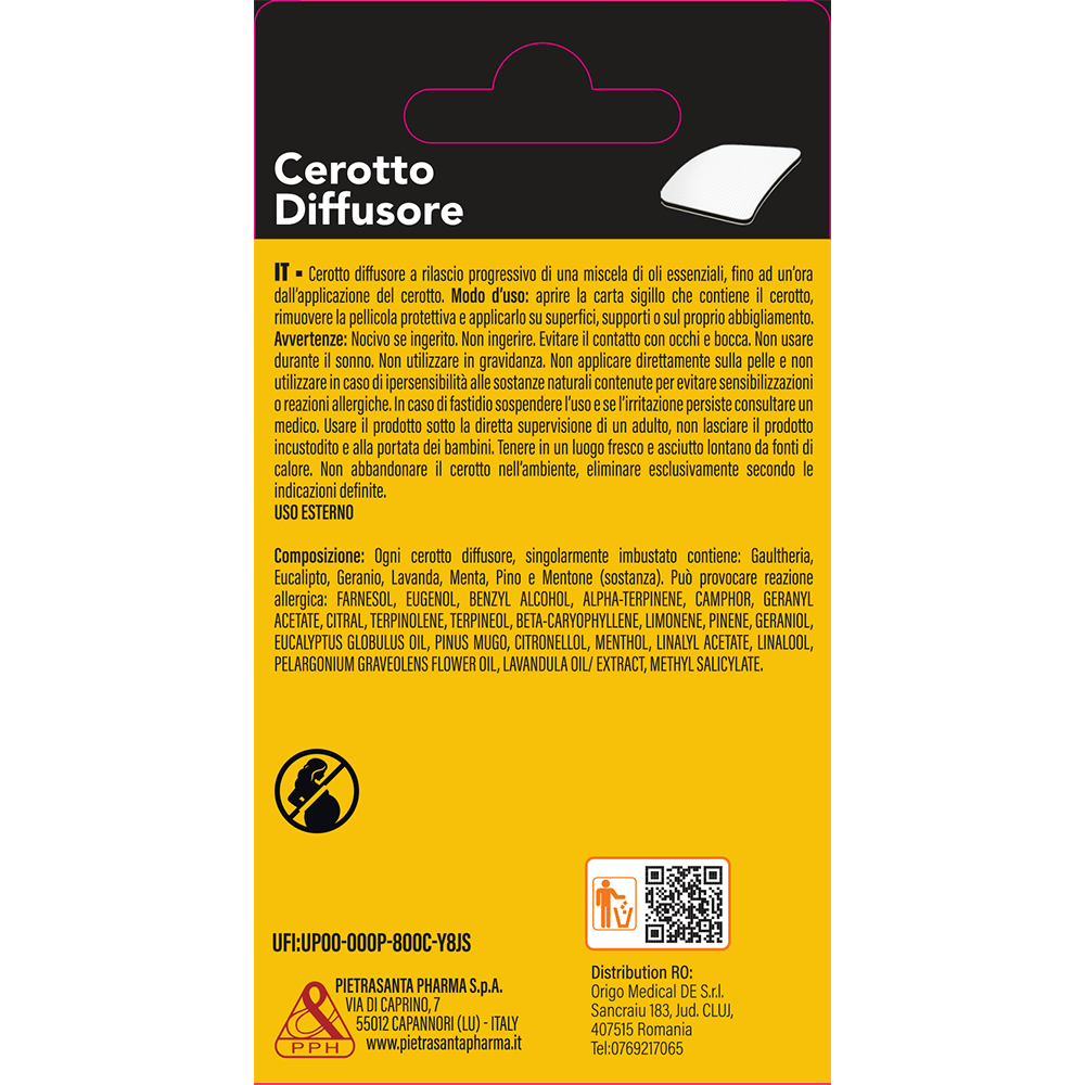 Modo d’uso: rimuovere la pellicola e applicare il cerotto su superfici, supporti o sul proprio abbigliamento.